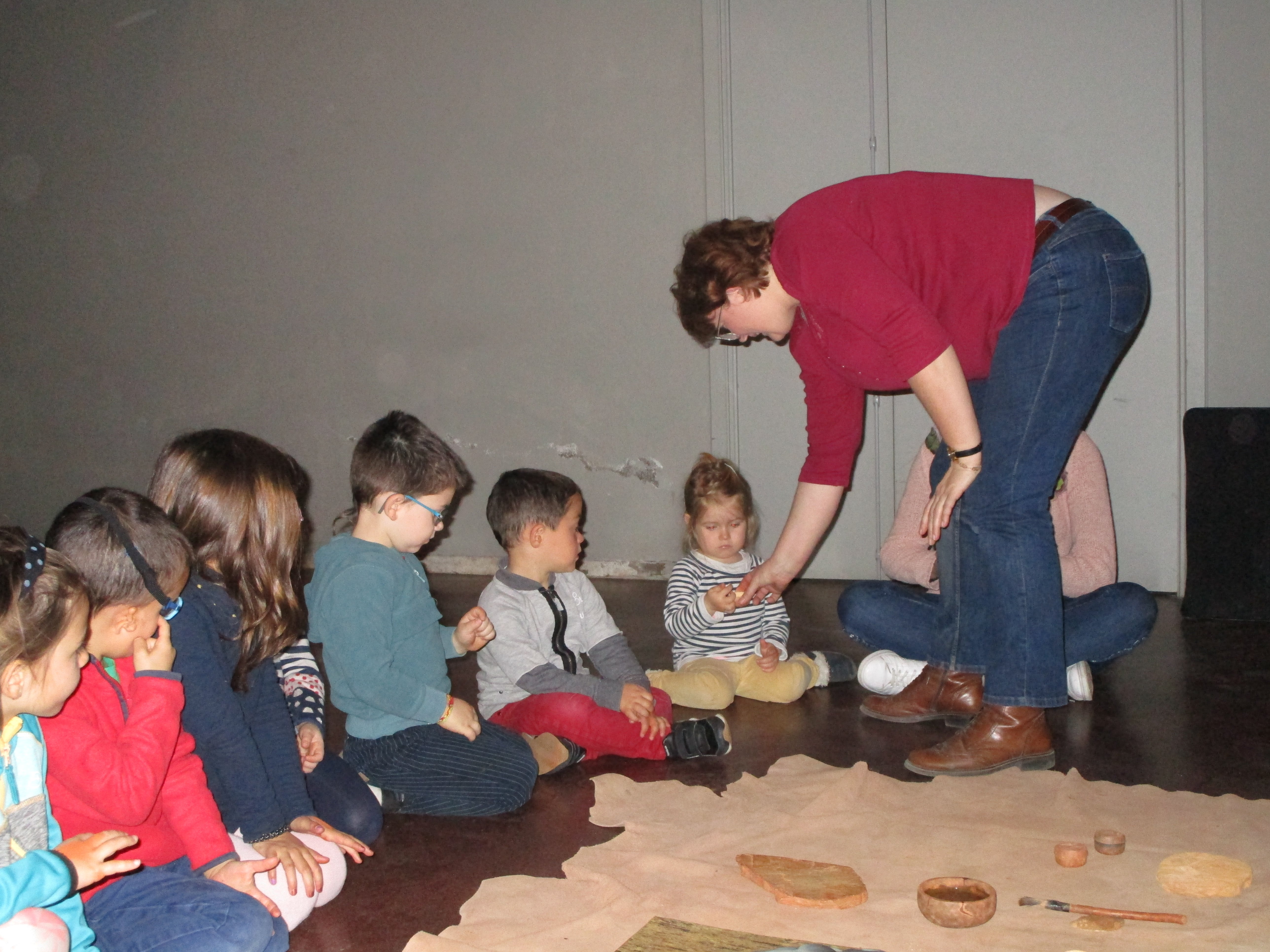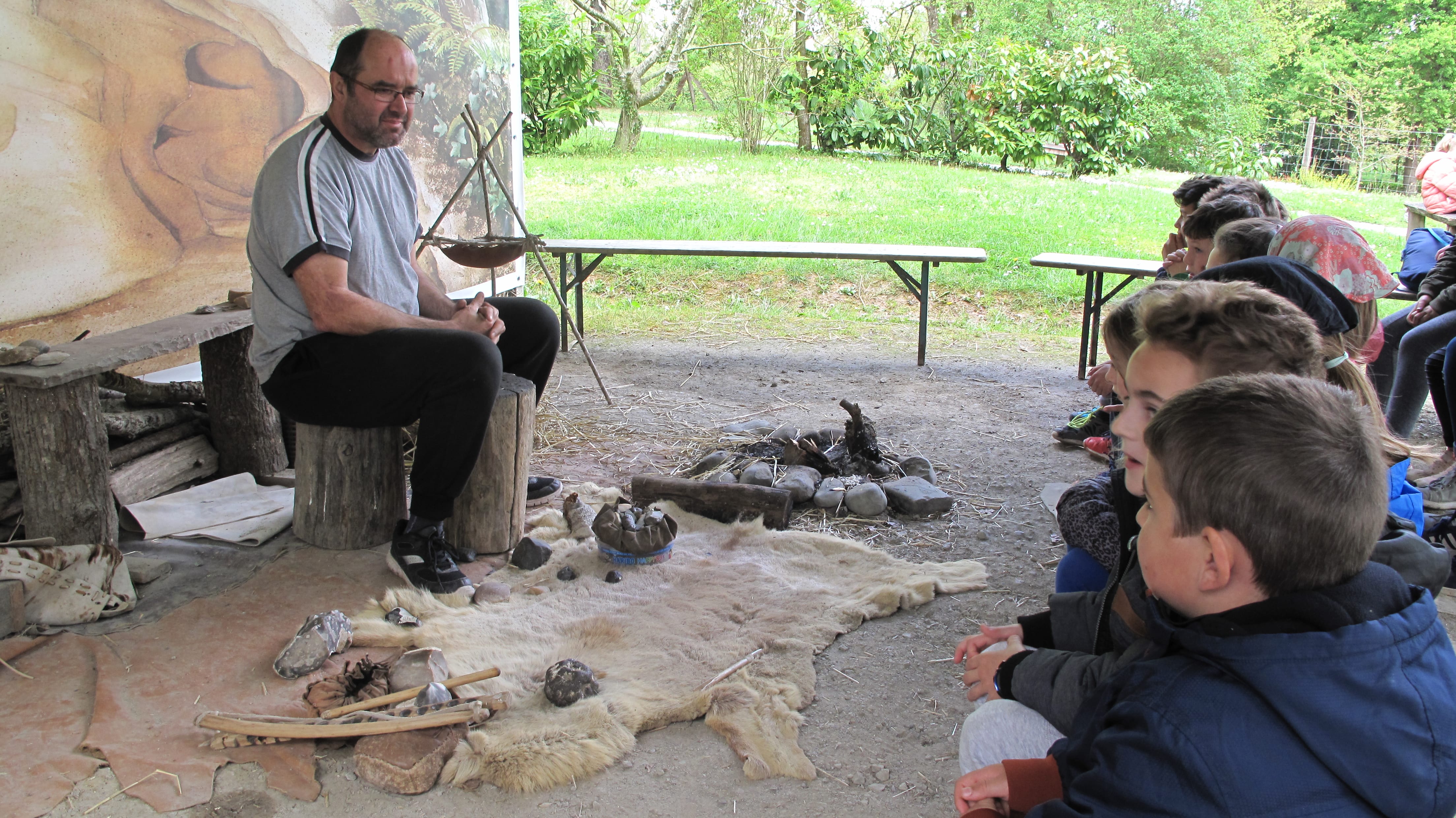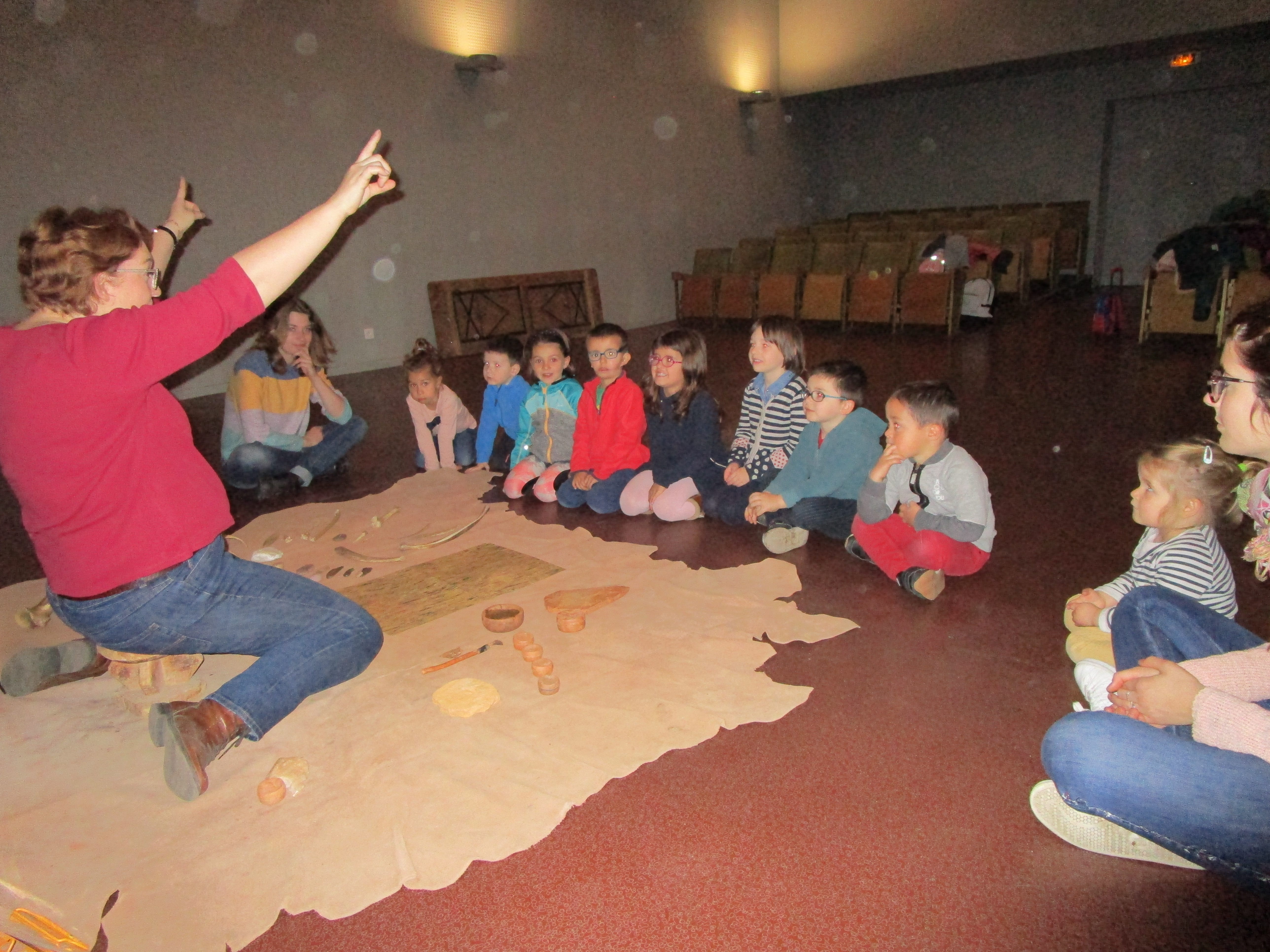 C'est Aude Labarge, médiatrice en Préhistoire de l'association Aulame qui va guider les enfants et les faire remonter dans le temps. Au travers d'une histoire contée, elle les entraîne sur son sillage et dresse le décor. Nous sommes au milieu de plaines, prêt à chasser le gibier qui passerait à proximité.