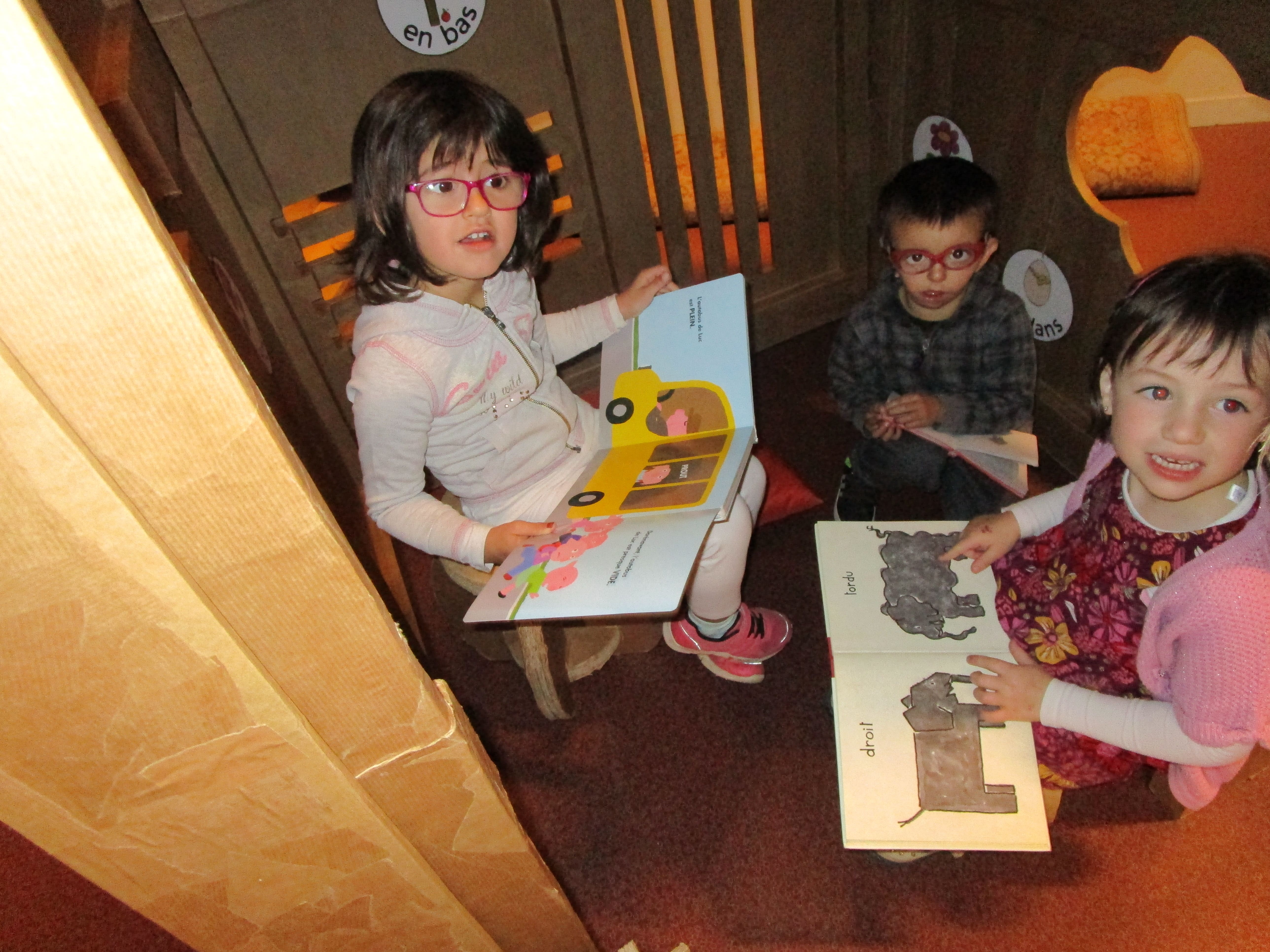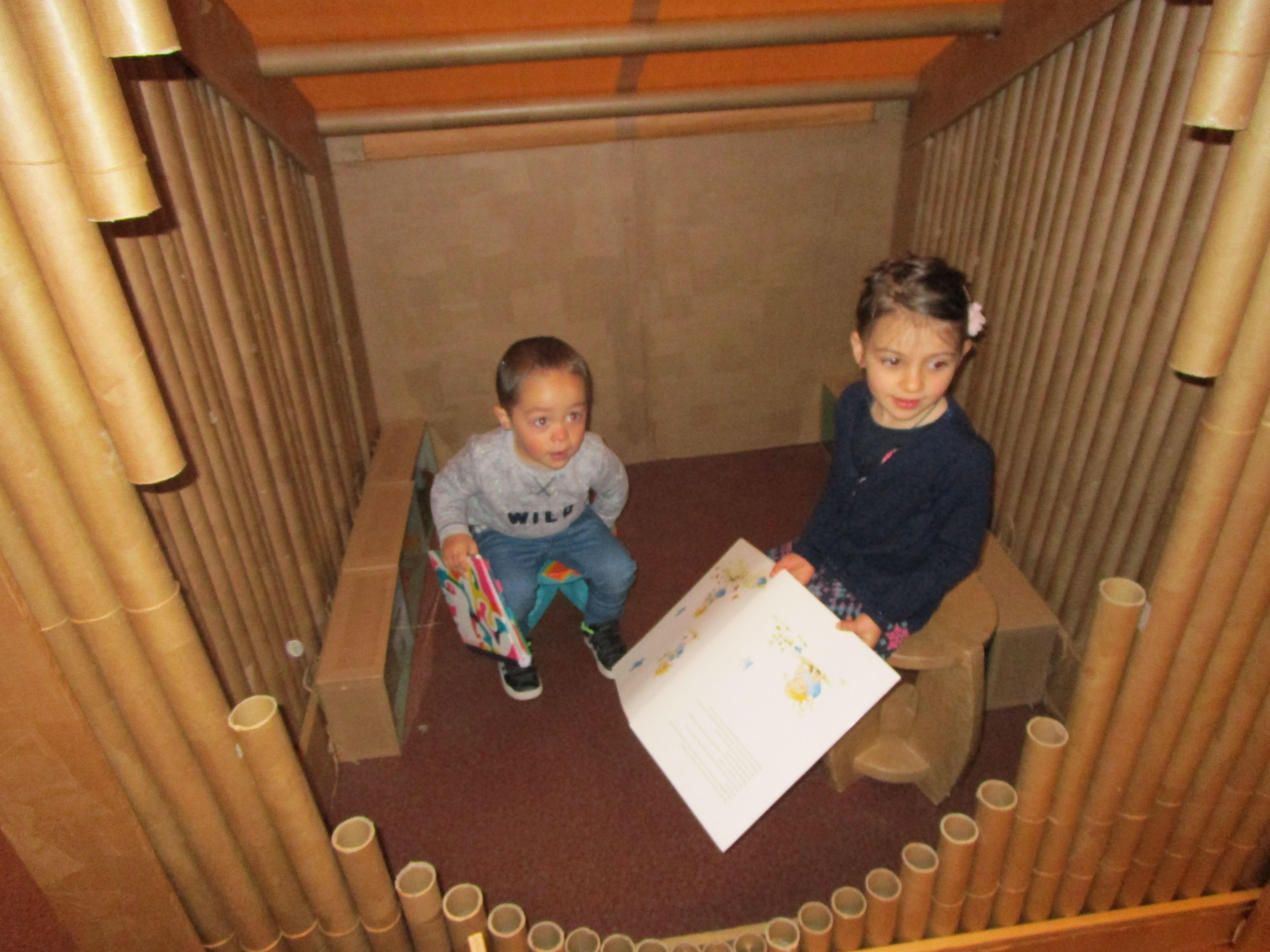 6 cabanes à découvrir où l'on peut jouer, raconter, découvrir en retrouvant à chaque fois des livres en lien avec chacune de ces cabanes. Les enfants se sont appropriés les lieux et ces espaces "cocons". Chacun à leur manière ils sont allés à la découverte de l'exposition, certains en partageant ce moment avec des camarades, d'autres en s'isolant autour des livres et des jeux présents dans les cabanes.
