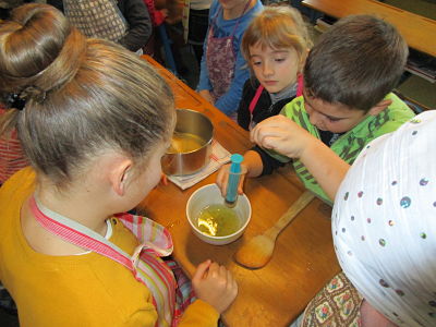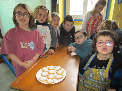 Une fois par semaine durant les mois de janvier et février, les enfants de toute l'école se sont répartis en 6 groupes (chaque groupe comprenant des enfants de la maternelle jusqu'au CM2) et ont réalisé les recettes suivantes : des billes de sirop parfumé, des spaghettis au chocolat et des sablés sous un nuage d'ananas,...